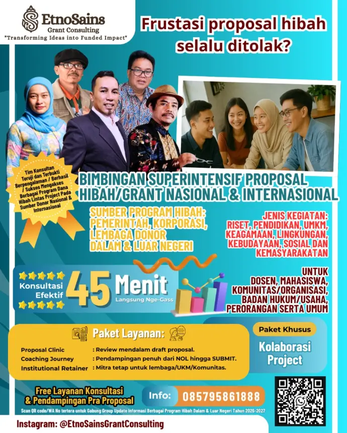 EtnoSains Grant Consulting (PT. Fajar Bersinergi Wiraksara) adalah konsultan profesional yang berfokus pada pendampingan penyusunan proposal hibah kompetitif, baik dalam maupun luar negeri. Dengan tim yang berpengalaman di berbagai bidang (penelitian, pendidikan, kebudayaan, lingkungan hidup, sosial, humaniora, sains dan kewirausahaan), kami berkomitmen membantu klien mengakses dana hibah dengan strategi yang tepat dan proposal yang berkualitas.